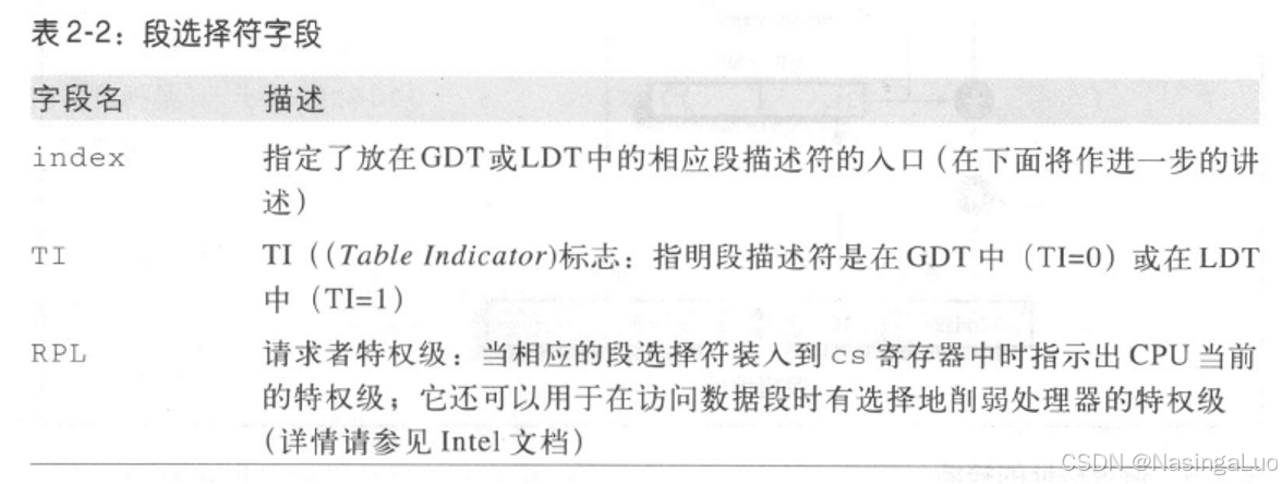 段选择符有16位,高13位index用于在GDT或LDT中选择段描述符。第3位TI用于表示是在全局描述附表还是局部描述符表中选择。cs段选择符的第1~2位RPL指明了当前CPU的特权级(CPL),0表示内核态,3表示用户态。