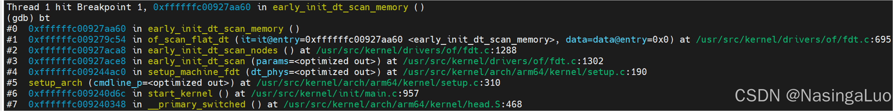 在start_kernel中,会扫描设备树中的各个节点。其中,扫描内存设备节点的调用路径如下所示: