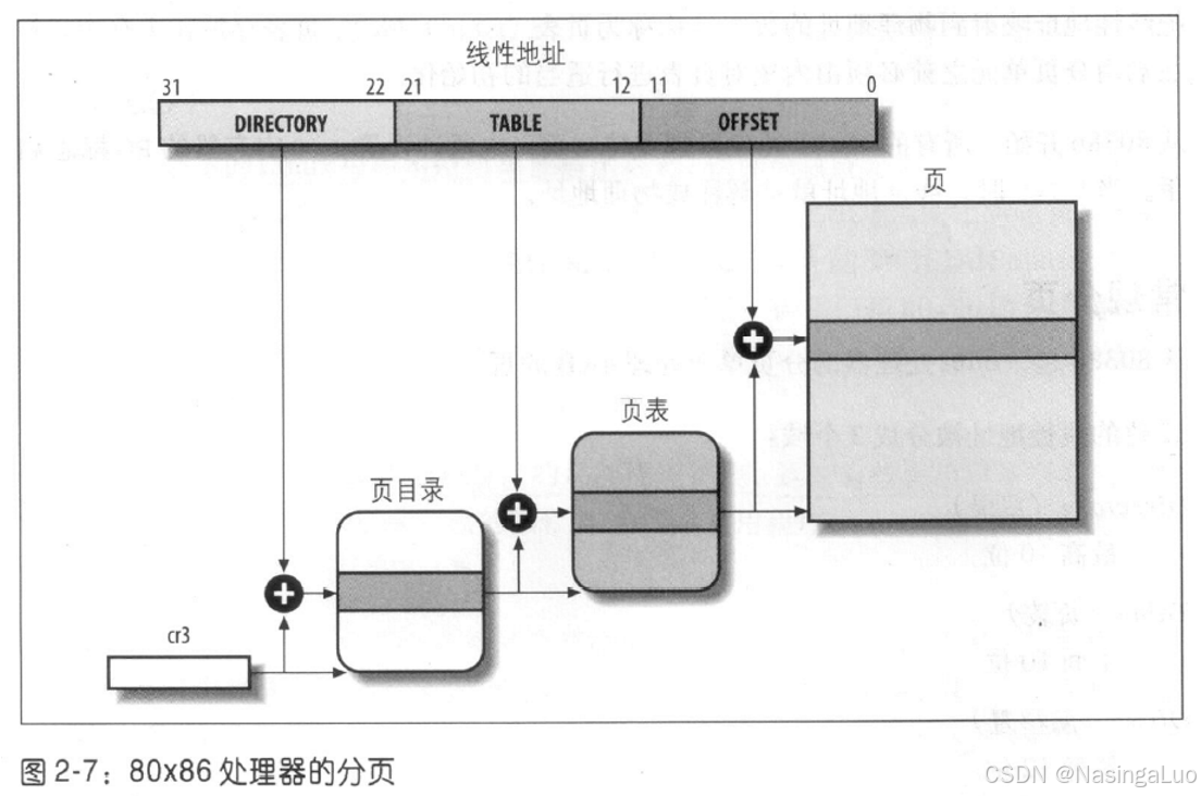 之前的分段已经将逻辑地址转化成了线性地址。还需要借助分页,将线性地址转化成物理地址。其中,一个关键任务是将访问类型和线性地址的访问权限相比较,如果这次的访问无效,就产生一个缺页异常。