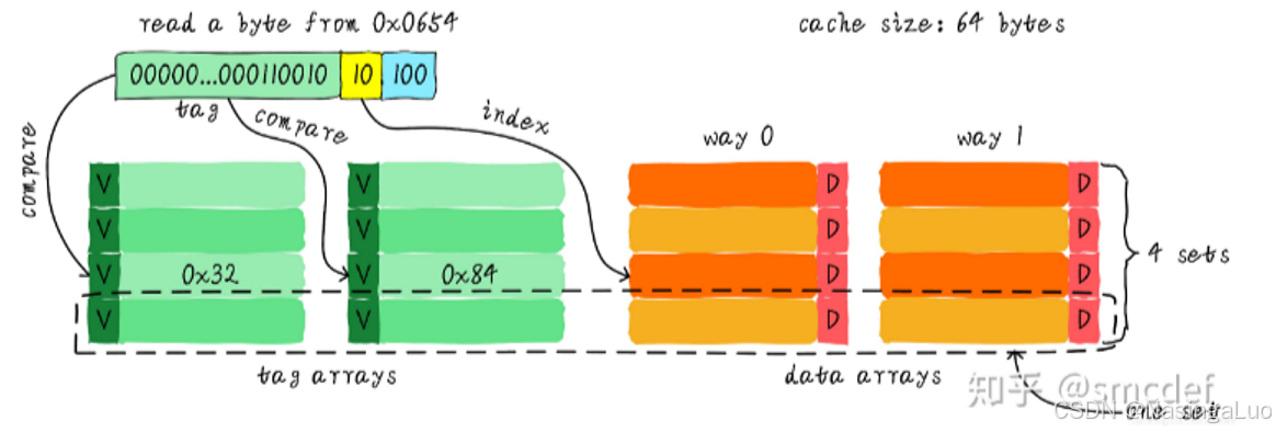 这时,加入我们还是需要查找地址为0x0654位置的数据。这时候,地址的最后三位(offset)还是用于从一个cache line的8个字节中选择一个字节。但是这时候的索引(index)只需要两位即可。因为cache line总共只有4行,也就是一路只有4个cache line。