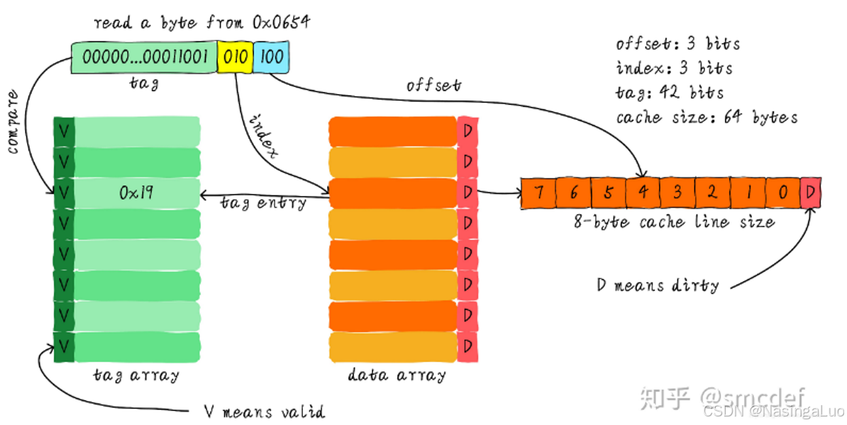 假设我们要访问0x0654地址上存储的数据。由于每个cache line是8个字节。因此,我们需要用地址的最后三位(offset,蓝色部分)来定位cache line中的数据。此外,总共有8个cache line。因此,我们还需要地址中的三位(index,黄色部分)来确定是哪一条cache line。很多地址的最后六位是相通的,仅凭六位地址显然无法进行区分,还需要剩下的位数。因此,将剩下的位数(绿色部分)放入tag中,每个tag和每个cache line对应。tag最前面的V表示这条cache line是否有效。
