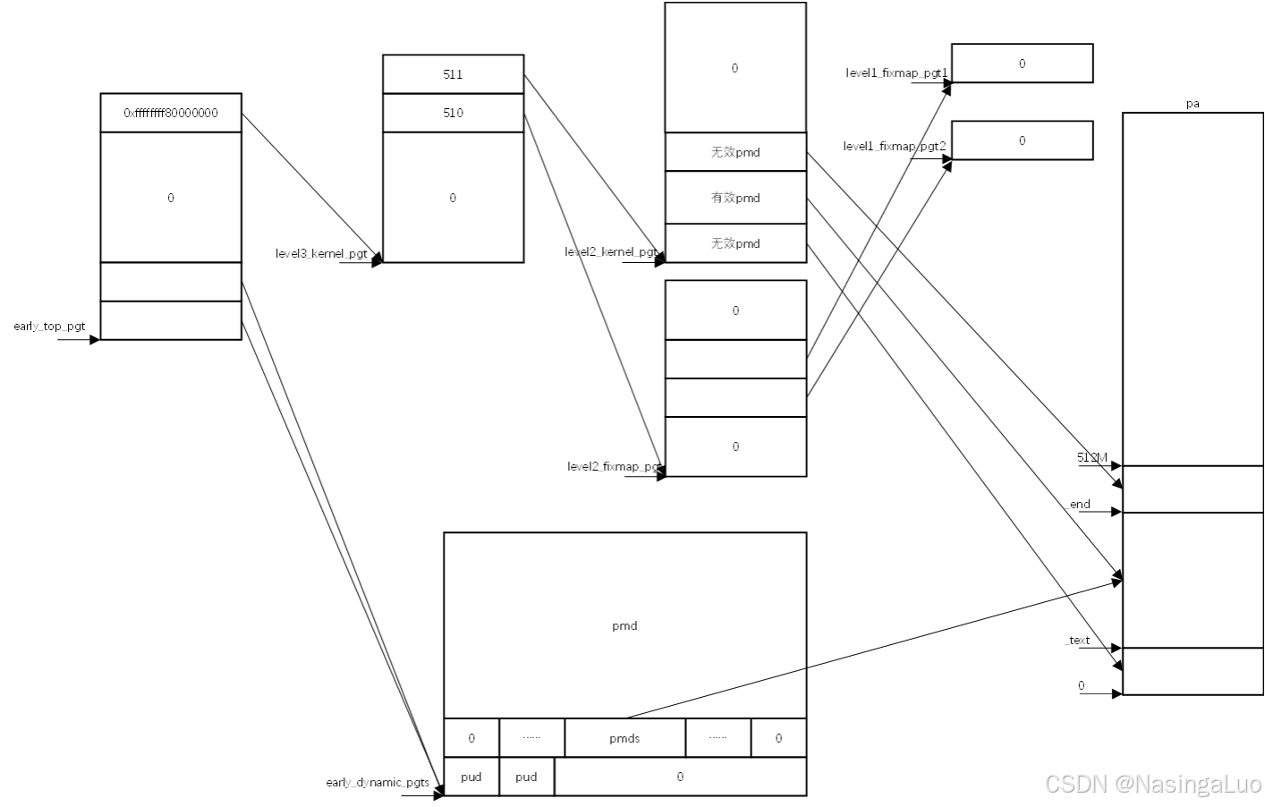 这张页表的建立过程在快速笔记——x86_64的启动过程中有详细描述。这里只说明这个页表的建立结果,如下所示: