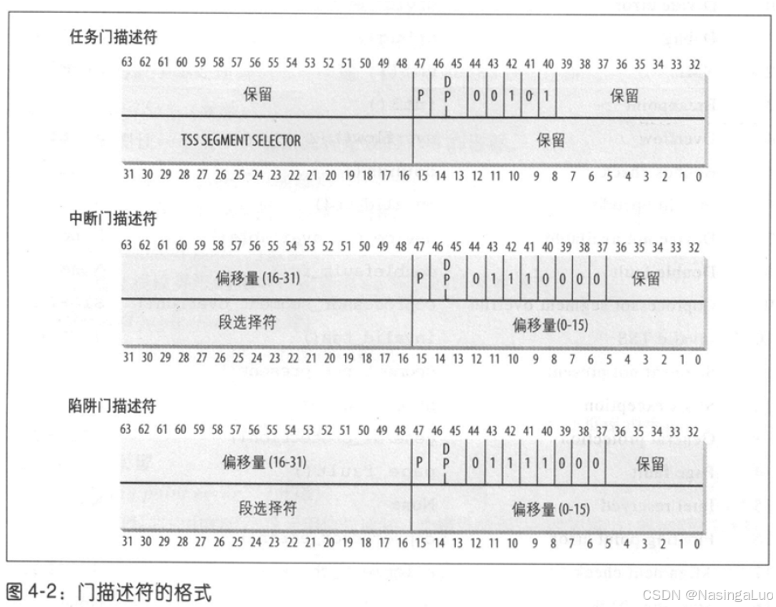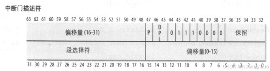 在保护模式下,中断描述符表中的表项由8个字节组成。其中的每个表项叫做一个门描述符,意味着当中断发生时,必须先通过这些门,然后才能进入相应的处理程序。表项的格式如下: