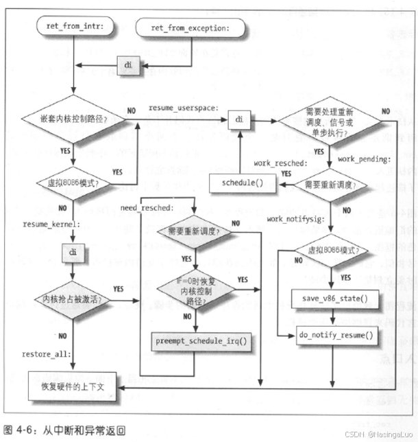 中断和异常返回分别使用两个不同的入口点:ret_from_exception和ret_from_intr。此外,我们还要考虑,我们的退出流程需要做些什么。他们的实现如下所示: