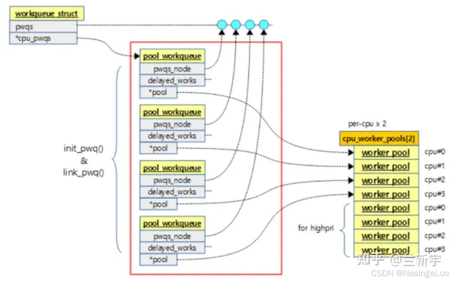pwq_cache = KMEM_CACHE(pool_workqueue, SLAB_PANIC); //创建了pool_workqueue类型的slub /* initialize CPU pools */ for_each_possible_cpu(cpu) { struct worker_pool *pool; i = 0; for_each_cpu_worker_pool(pool, cpu) { //初始化数据结构cpu_worker_pool。这个数据结构中存放了每个cpu的工作线程 BUG_ON(init_worker_pool(pool)); pool->cpu = cpu; cpumask_copy(pool->attrs->cpumask, cpumask_of(cpu)); pool->attrs->nice = std_nice[i++]; pool->node = cpu_to_node(cpu); /* alloc pool ID */ mutex_lock(&wq_pool_mutex); BUG_ON(worker_pool_assign_id(pool)); mutex_unlock(&wq_pool_mutex); } }