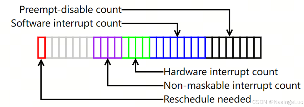 //要求在关中断,开内核抢占的情况下运行这个函数 asmlinkage void __sched preempt_schedule_irq(void) { #ifdef CONFIG_PREEMPT_BKL //这个宏的作用是,打开了之后,就算一个进程持有大内核锁,这个进程也会被抢占 #endif need_resched: add_preempt_count(PREEMPT_ACTIVE); local_irq_enable(); schedule(); //进行调度,这个函数会在调度章节中分析 local_irq_disable(); sub_preempt_count(PREEMPT_ACTIVE); barrier(); if (unlikely(test_thread_flag(TIF_NEED_RESCHED))) goto need_resched; } |
