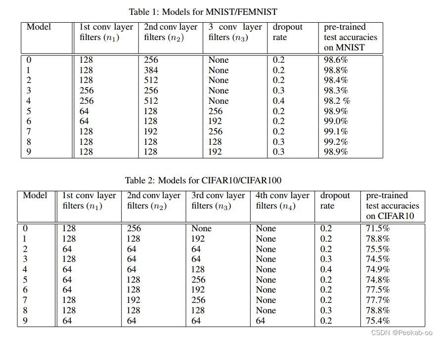 在每个环境中,10 名参与者设计出独特的卷积网络,这些网络的通道数和层数各不相同,详见表 1 和表 2。这些模型在 MNIST 和 CIFAR10 上的测试准确率分别为 99% 和 76%。其次,每个参与者在自己的小型私有数据集上训练自己的模型。完成这些步骤后,它们将进入协作训练阶段,在此期间,模型将获得全面而快速的改进,并迅速超越迁移学习的基线。我们使用Adam优化器,初始学习率为 0.001;在每一轮协作训练中,我们随机选择一个大小为 5000 的子集