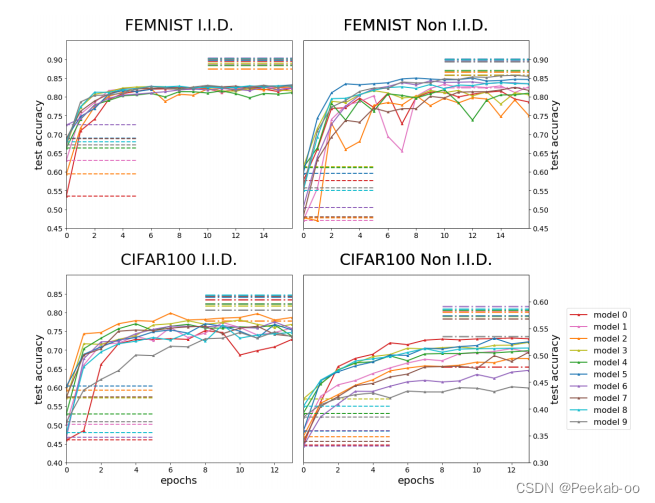 CIFAR非i.i.d.分布中的模型 0。此外,该模型的性能在大多数情况下都名列前茅。该模型具有最简单的架构,通常落后于更复杂的同类模型。了解这一成功背后的机制并利用它来改进我们的框架是很有趣的。 - 我们的框架可以包含模型异质性的极端情况。我们尝试了几种性能低得多的模型,例如两层全连接网络。如果它们对consensus的贡献与先进模型具有相同的权重,那么它们往往会阻碍群体的准确性。如果我们用较低的权重抑制它们的贡献,我们的框架会更好地工作。
