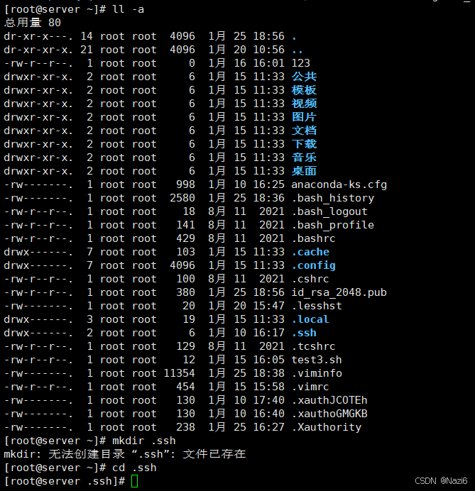 没问题,然后第一次操作的时候默认没有ssh这个文件,就得自己创建,我这里是有的,再敲一遍是为了给大家演示