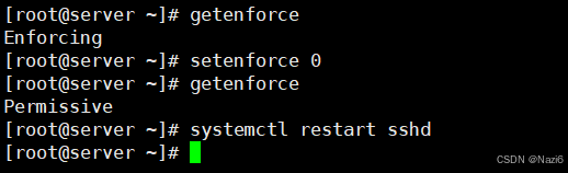 那么我们把selinux中的运行模式设置成宽容模式,然后再重启(Enforcing强制模式、Permissive宽容模式和Disabled关闭模式。)