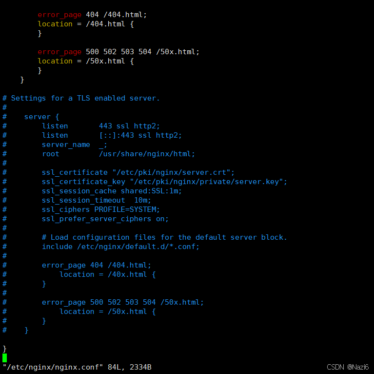 在/etc/nginx/nginx.conf这里面,我们现在要抓包,只需要看到一个测试页面,这个测试页面在哪里,就需要通过这个配置文件来找到