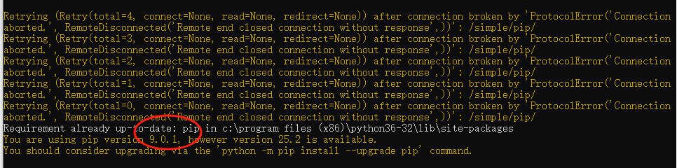 然后在命令提示符中输入:python -m pip install --upgrade pip -i https://pypi.douban.com/simple --trusted-host pypi.douban.com,升级pip,结果失败了,显示的版本还是9.0.1.
