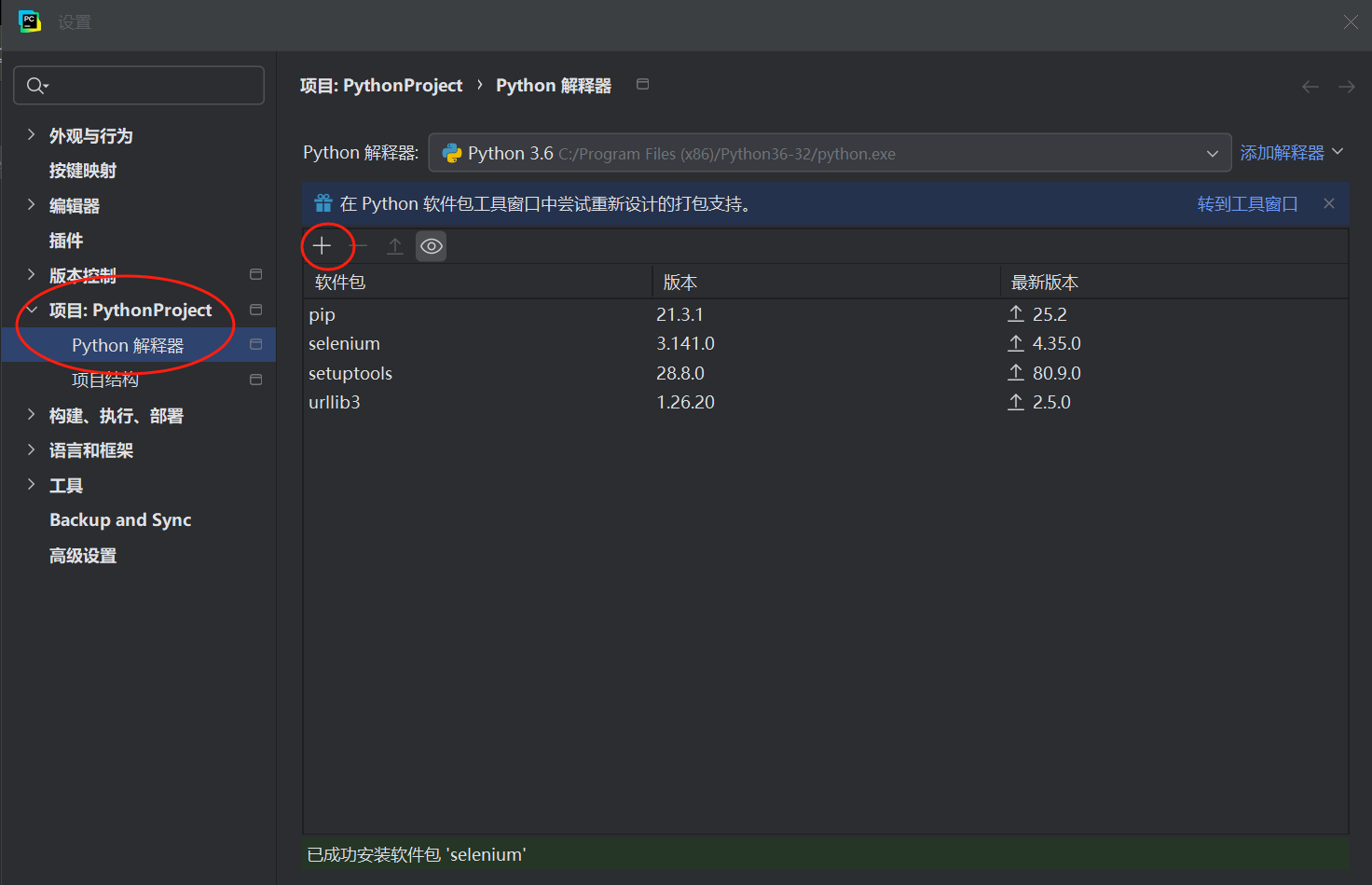 打开设置,找到项目、python解释器,点击+,直接搜索selenium进行安装。