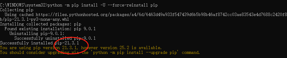 不死心,又重新试了强制重新安装:python -m pip install -U --force-reinstall pip