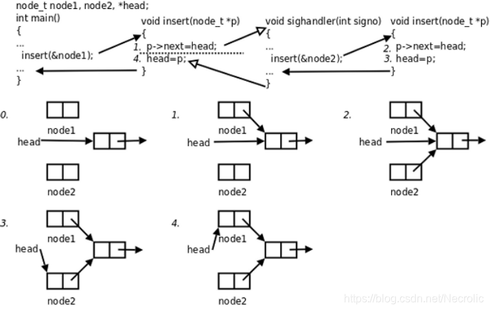 显然,insert函数是不可重入函数,重入调用,会导致意外结果呈现。究其原因,是该函数内部实现使用了全局变量。