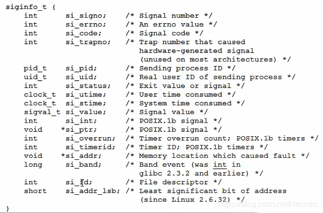 当注册信号捕捉函数,希望获取更多信号相关信息,不应使用sa_handler而应该使用sa_sigaction。但此时的sa_flags必须指定为SA_SIGINFO。siginfo_t是一个成员十分丰富的结构体类型,可以携带各种与信号相关的数据。