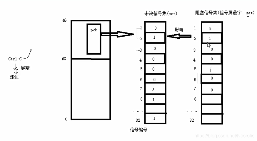 2. 信号产生后由于某些原因(主要是阻塞)不能抵达。这类信号的集合称之为未决信号集。在屏蔽解除前,信号一直处于未决状态。