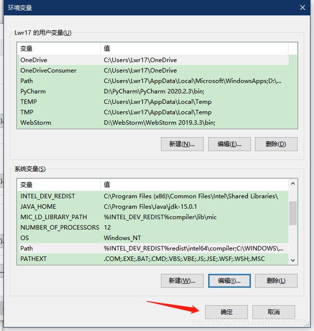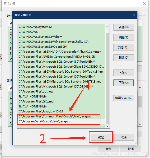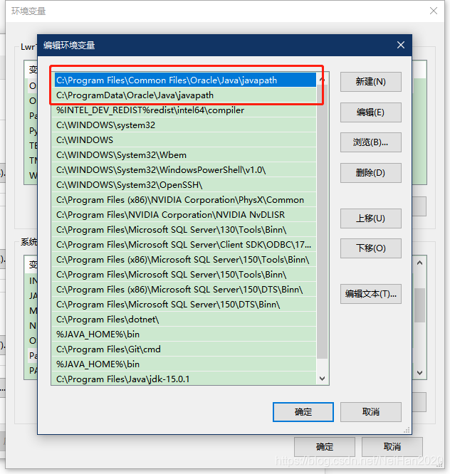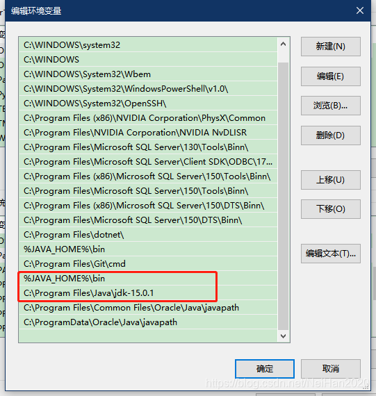 2.个人理解:那两条环境变量是软件自身提供的环境变量,但是版本比较低,程序打开时在Path中从上到下匹配环境变量,先匹配到那两个版本比较低的环境变量,所以就会提示版本过低,而把这两条变量移到最下边,软件打开时就会匹配到这两条已经配置好的JDK版本为15的变量,就可以正常进入了!