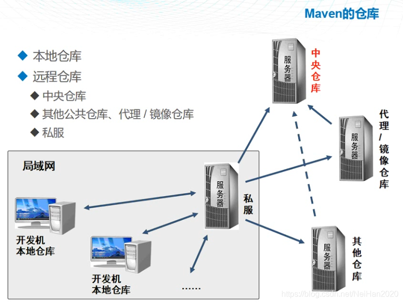 在本地仓库中找不到需要的依赖,Maven将去私服中搜索依赖,找到后拷贝私服中的依赖到本地仓库. 若私服中找不到依赖,私服将会到远程仓库下载并保存到私服仓库中,同时向本地仓库传输1份依赖.如果仓库环节中缺少某个仓库,如缺少私服或者其他公共仓库,会跳过访问这个仓库的步骤,直接访问优先级更低的仓库