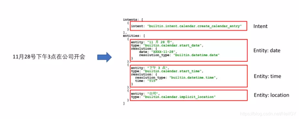 以上是NLU服务的例子。输入是「11月28号下午3点在公司开会」,返回的结果中能正确的将意图识别为创建日程,而对应实体,如日期、时间、地点都能被准确的抽取出来。