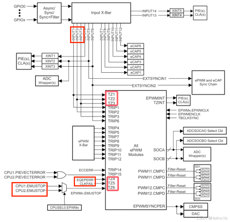 TZ1 to TZ3 are sourced from the GPIO mux. TZ4 is sourced from an inverted EQEPxERR signal on those devices with an EQEP module. TZ5 is connected to the system clock fail logic, and TZ6 is sourced from the EMUSTOP output from the CPU.