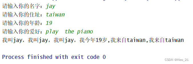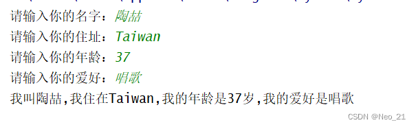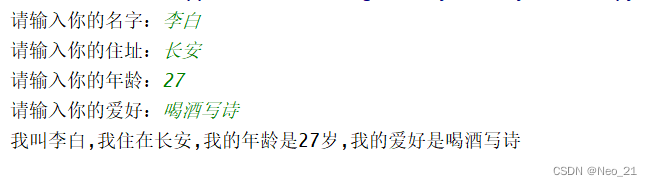 s = "我叫%s,我住在%s,我的年龄是%d岁,我的爱好是%s" %(name,address,age,hobby)