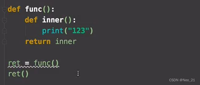 通用装饰器 def wrapper(fn): #wrapper 装饰器,fn:目标函数 def inner(*args,**args): # 在目标函数执行之前 ret = fn(*args,**args) #执行目标函数 return ret #返回值 return inner #千万不要加() @wrapper def target(): psaa target() # =>inner()#基本的原理 #进行封装 def game_help(game): def inner(): print("开始游戏") game() print("关闭游戏") return inner def play_csgo(): print("RUSH B") def play_lol(): print("且随疾风前行") #重新封装的游戏 play_csgo = game_help(play_csgo) play_lol = game_help(play_lol) play_lol() //terminal 开始游戏 且随疾风前行 关闭游戏