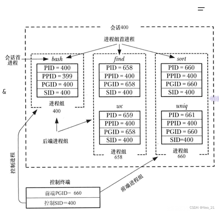 - 进程组和会话在进程之间形成了一种两级层次关系:进程组是一组相关进程的集合,会话是一组相关进程组的集合。