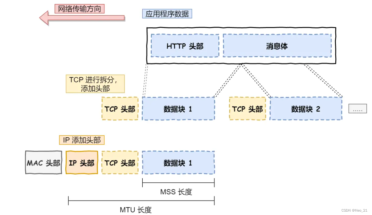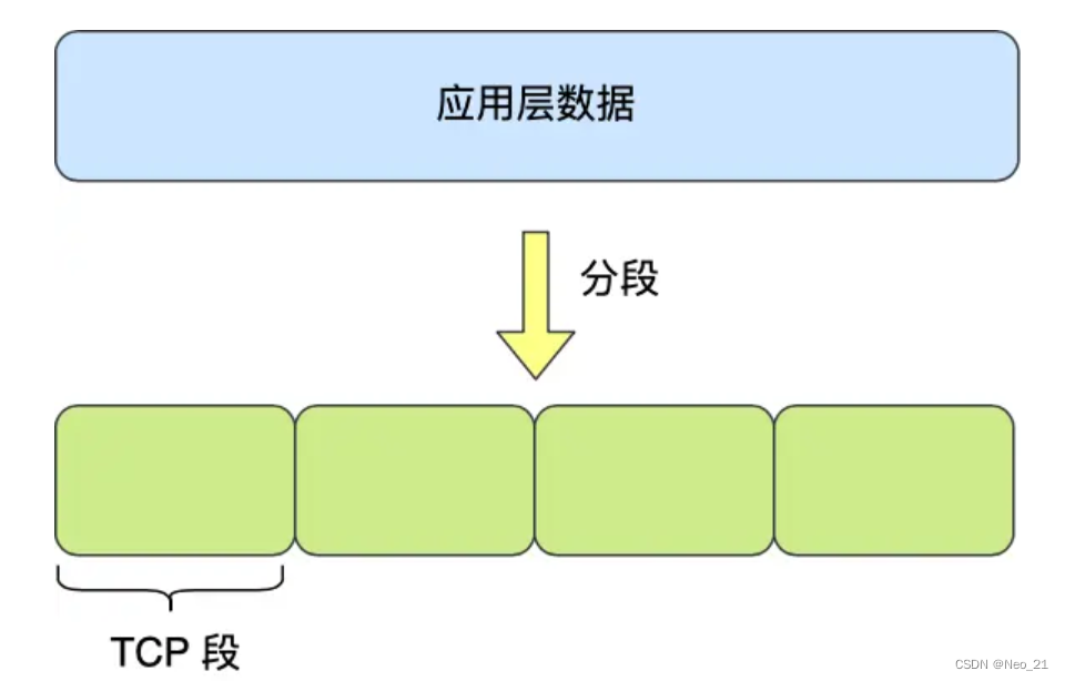 应用需要传输的数据可能会非常大,如果直接传输就不好控制,因此当传输层的数据包大小超过 MSS(TCP 最大报文段长度) ,就要将数据包分块,这样即使中途有一个分块丢失或损坏了,只需要重新发送这一个分块,而不用重新发送整个数据包。在 TCP 协议中,我们把每个分块称为一个 TCP 段(TCP Segment)。