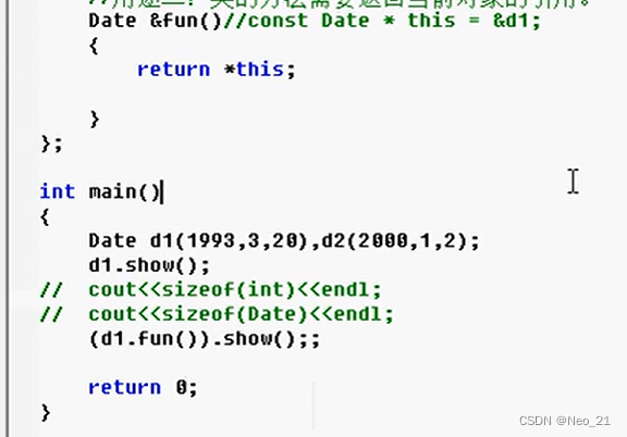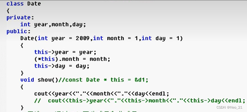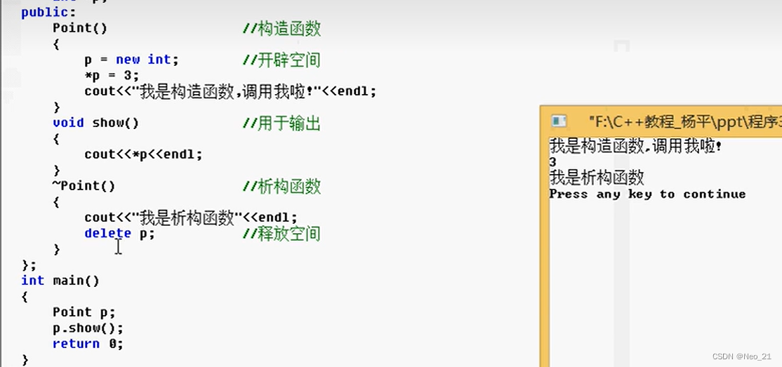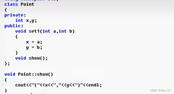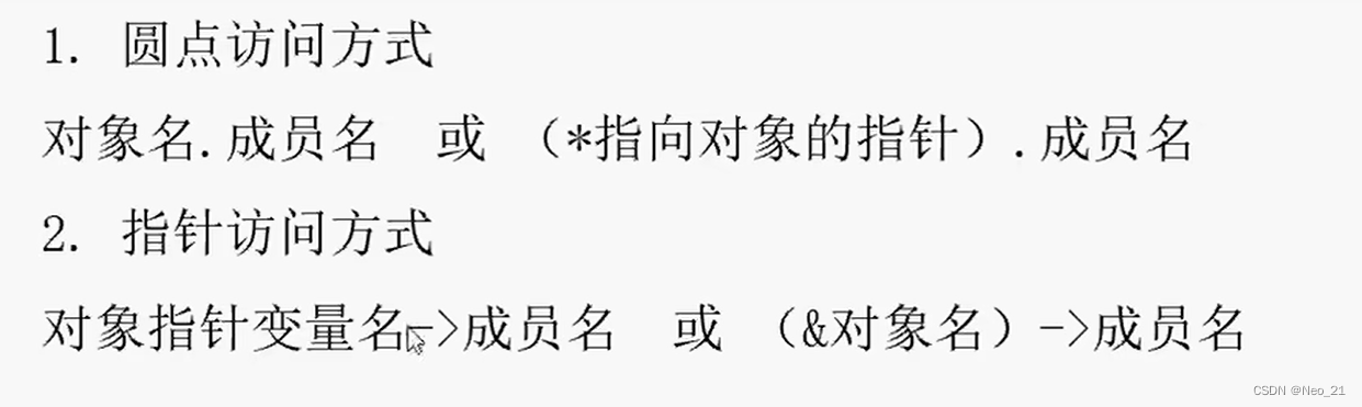 point *point_p1; point_p1 = &p1; //定义一个指针,并且赋予指针意义,指向p1的地址 point_p1->set(1,2); //使用指针访问成员变量 p1.show(); (*point_p1).set(2,3); //使用对象访问成员 (&p1)->show()