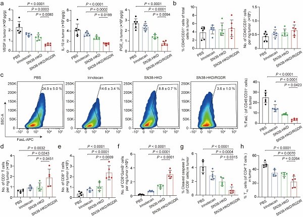 研究表明,SN38-HKD/RGDR通过减少TECs的前列腺素E2(PGE2),降低骨髓来源巨噬细胞和肿瘤细胞的血管内皮生长因子(VEGF)和白介素10(IL-10)的水平,从而协同下调TECs的FasL表达。