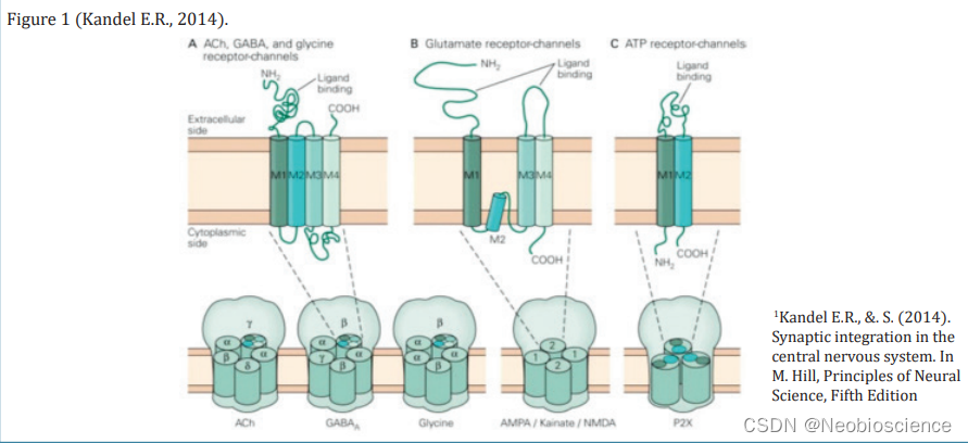 1 - 离子型受体 (配体门控受体) 结合离子配体,如:K+, Na+, Cl–, 和 Ca2+. 这类受体的例子有:半胱氨酸环受体 (nAch-R, GABA-R, Glycine-R, 5HT-R), 谷氨酸受体, 和嘌呤受体。