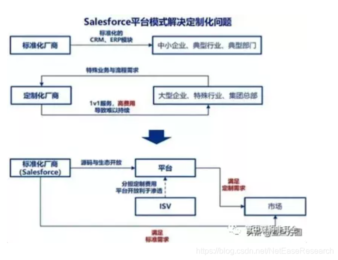 作为全球低代码开发平台的核心玩家,outsystems等通用平台企业和salesforce等传统软件企业,通过打造低代码平台提供给企业或合作ISV完成场景化应用开发,进而来满足了市场需求,已成为一条现实可行的路径。同时随着平台逐步成熟和使用的客户增多,企业(或ISV)和平台之间将逐步构建起一个共生共赢的生态。