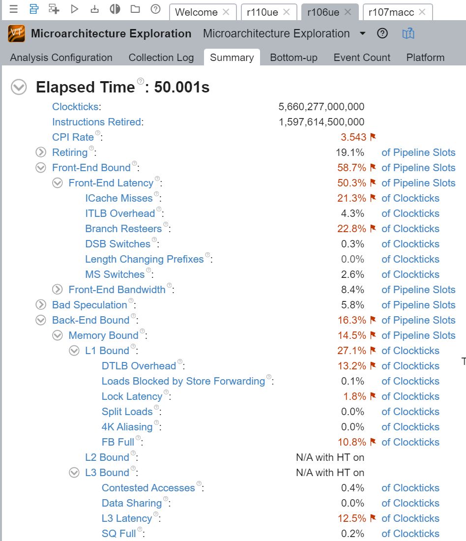 同时使用Intel VTune Profiler采集CPU微架构相关性能数据,结果如下图所示: