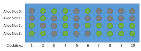 我们可以用流水线槽(pipeline slot)代表处理一个 uOp 所需的硬件资源。在最近的英特尔微体系结构上,流水线的 Front-end 每个 CPU 周期可以分配4个 uOps ,而 Back-end 可以在每个周期中退役4个 uOps。在每个 CPU 周期中,pipeline slot 可以是空的或者被 uOp 填充。 如果在一个 CPU 周期内某个 pipeline slot 是空的,称之为一次停顿(stall)。如果 CPU 经常停顿,系统性能肯定是受到影响的,如下图所示(绿色圆圈表示该流水线槽有微指令运行,灰色圆圈表示没有):