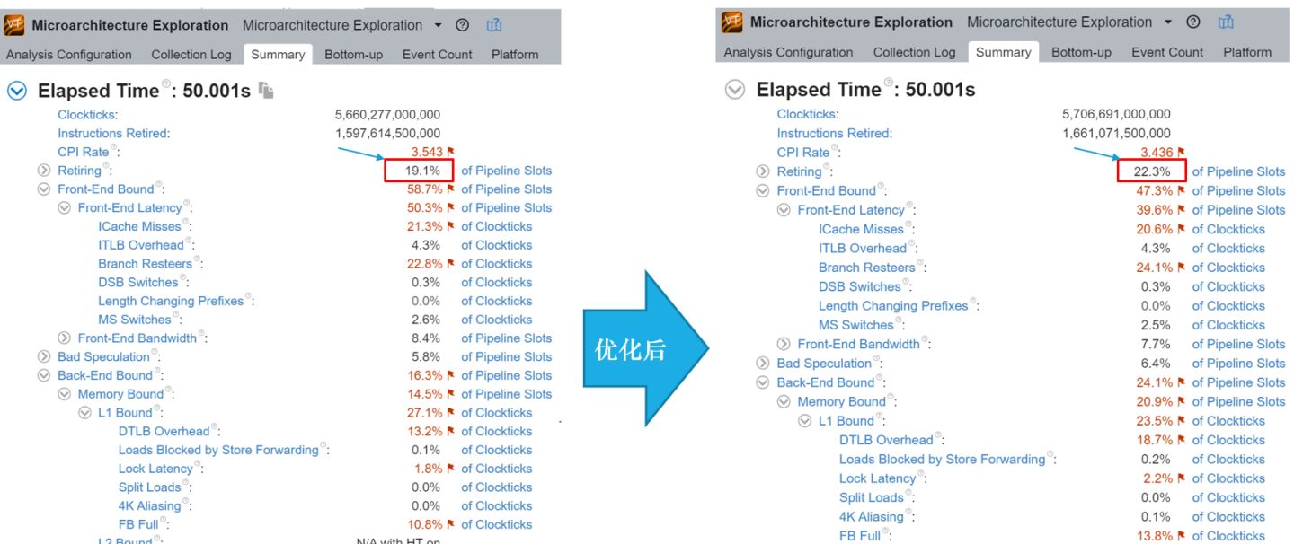 从vtune的微架构性能数据看,编译优化后cpu的pipeline slots的retiring比例从19.1%提升到了22.3%。