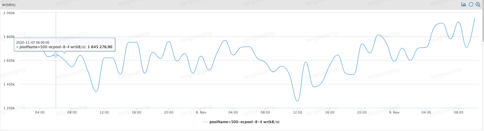 执行离线写入阶段,控制集群的整体写入速度 2GB/s 左右,而实际我们使用 rados bench 工具压测时写入峰值可达 6GB/s+