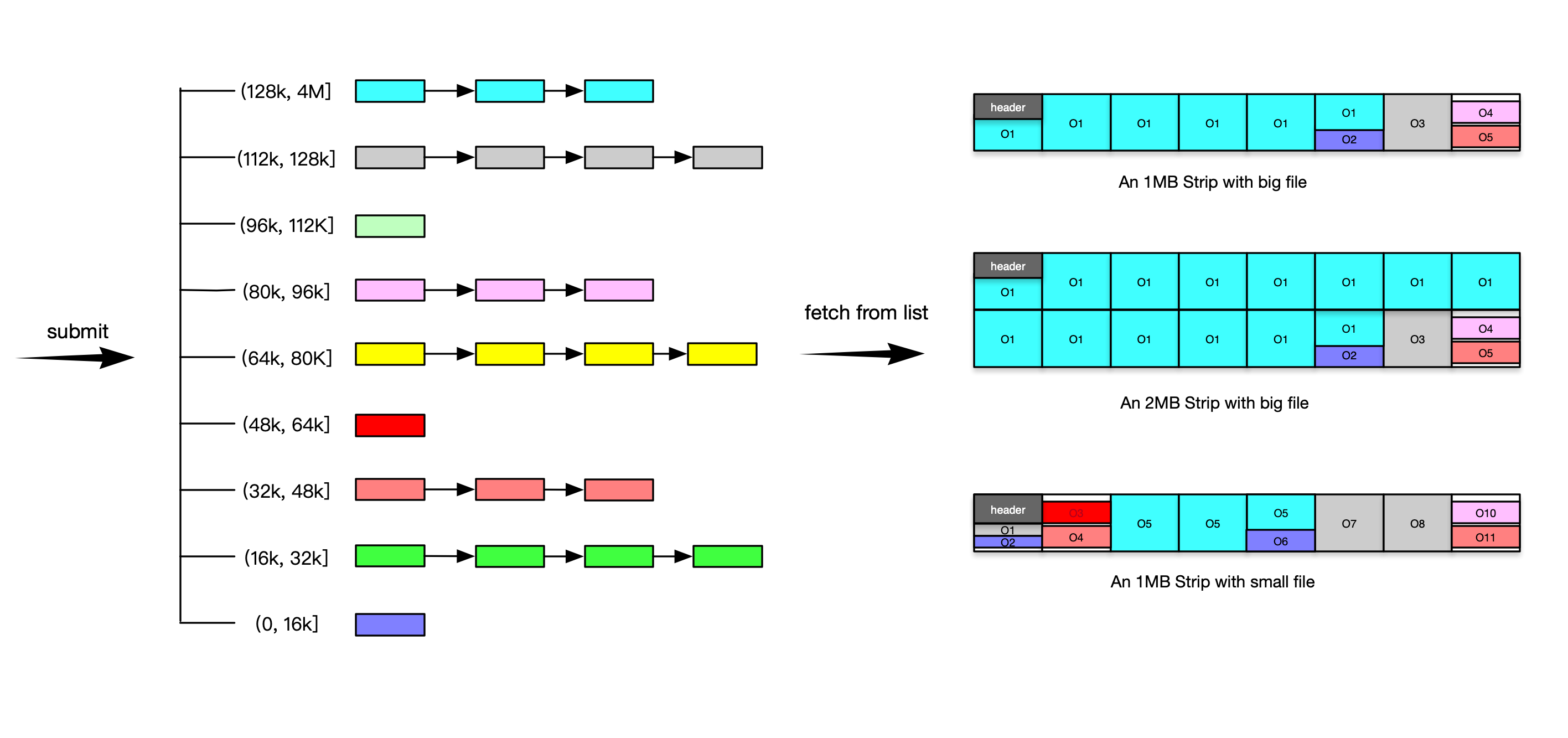 举例条带拼装过程,如上图(条带拼装示意图 - An 1MB Stripe with small file)
