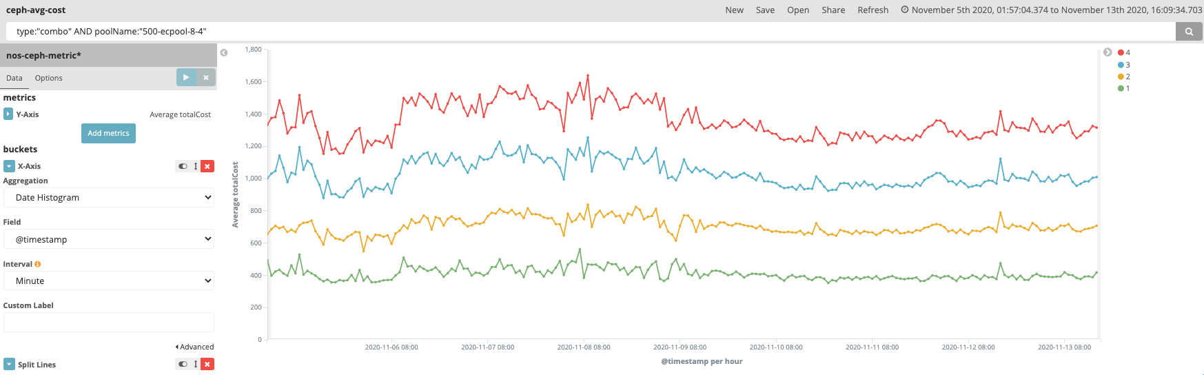 从下图可以看出,我们有 1 - 4 个条带合并写的情形,但条带的写入延时在 400ms 左右,4 条带的写入延时在 1600ms 左右;即对于 1M的数据写底层 12 (8 +4) 个 osd 平均耗时在 400ms,因为我们是离线写入,latency 在可接受范围内。
