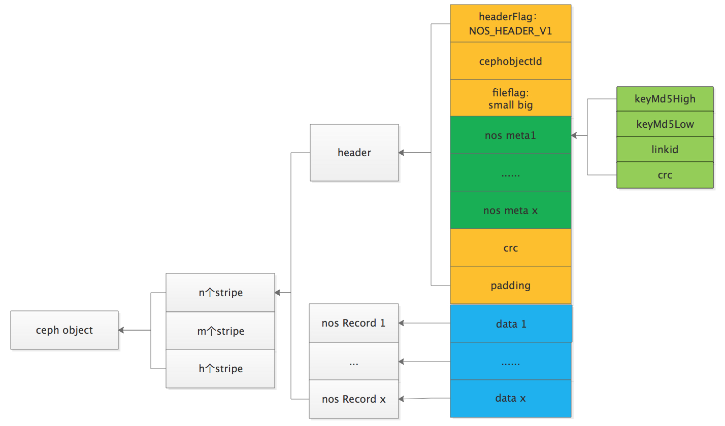 - header 中将 objectname 和 bucketname 替换成了 keymd5high 和 keymd5low;因为 objectname 是字符串,长度不定,如果在 header 部分存储完整的 objectname 一个是 header 长度不能确定,二是占用空间大(nos 平均对象名长达 60+ 字节)。而将对象名 hash 后拆分成 2 个 8 字节的 long 型记录解决上述问题(需要业务层数据记录映射关系)。