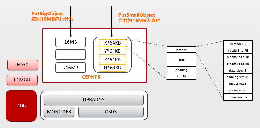 - PutSmallObject 所示箭头表示我们将 X/Y/Z/N 4 个对象写入了一个 Ceph 大块文件中记忆为 oid1, 每个文件的结构如虚线展开所示;当 oid1 中 Y 和 Z 被删除后需要重写 X 和 N 后可以删除整块 oid1;Y 和 Z 的删除由业务层通过标记删除后累加记录 oid1 上已经删除的大小