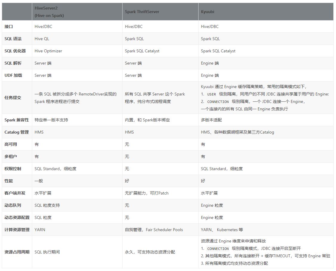 这里我们主要对网易数帆开源的 Kyuubi 项目与 Spark Thrift Server进行功能上的比较,对 Kyuubi 实现架构感兴趣的可参考 - Kyuubi: 网易数帆开源的企业级数据湖探索平台(架构篇)。此外,这里也引入HiveServer2 进行更加全面的分析。大致维度的对比,请见下表。