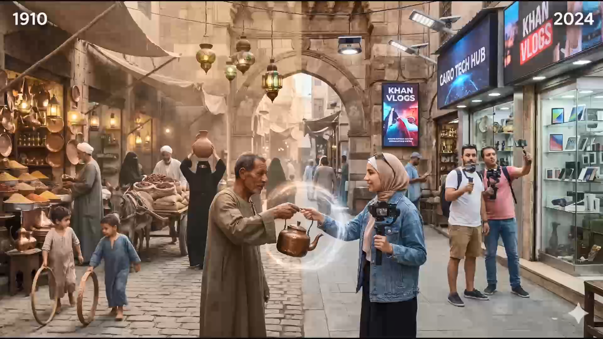 这种技法通过单一画面同时呈现同一地点的过去与现在。在左侧,你可以看到百年前的古老建筑、复古车马和身着时代服饰的人物;而右侧则是霓虹闪烁的玻璃幕墙与现代景观。其核心难点在于中心区域的平滑过渡,人物与建筑在交界处发生质感重塑,不仅提供了极强的细节表现力,更通过视觉对比构建了深刻的时间叙事感。