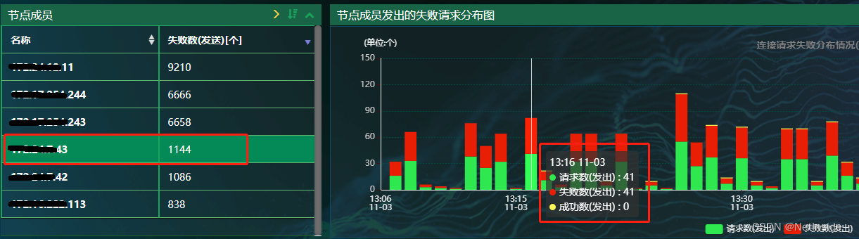 分析发现部分主机发出大量连接且均失败情况。如下图,左侧列出发生失败请求的主机和对应个数。