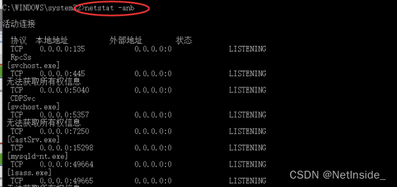 进入存在问题的主机,使用命令netstat –anb,查看与外部地址445端口连接的进程,确认并进行相应操作。