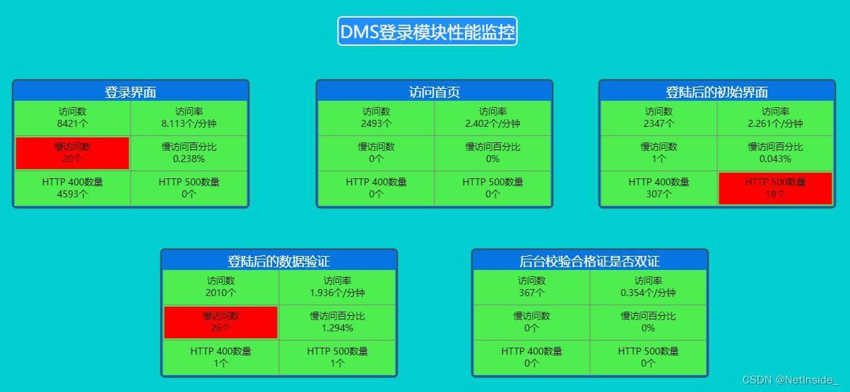 对登录模块功能监控:登陆界面出现慢访问20个,登陆后的初始界面出现HTTP 500报错18个,登陆后的数据验证出现慢访问26个。