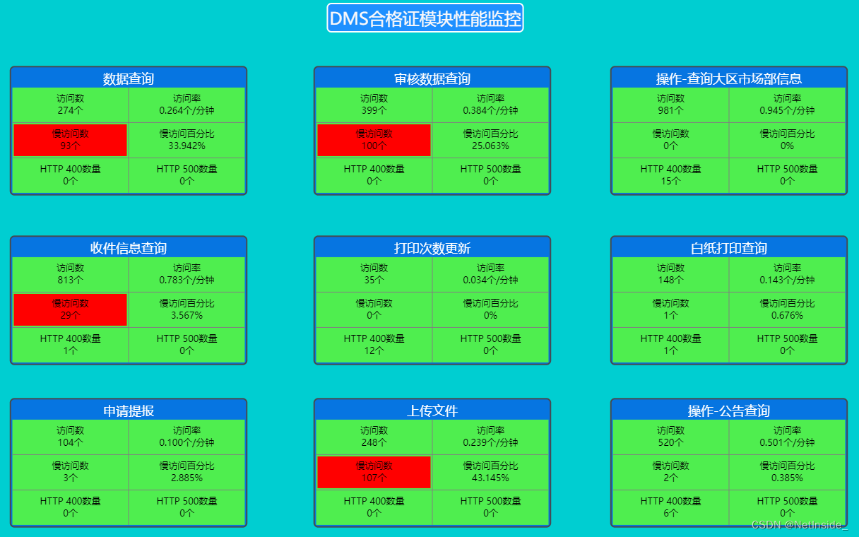 对合格证模块功能监控:数据查询出现慢访问93个,审核数据查询出现慢访问100个,收件信息查询出现慢访问29个,上传文件出现慢访问107个。