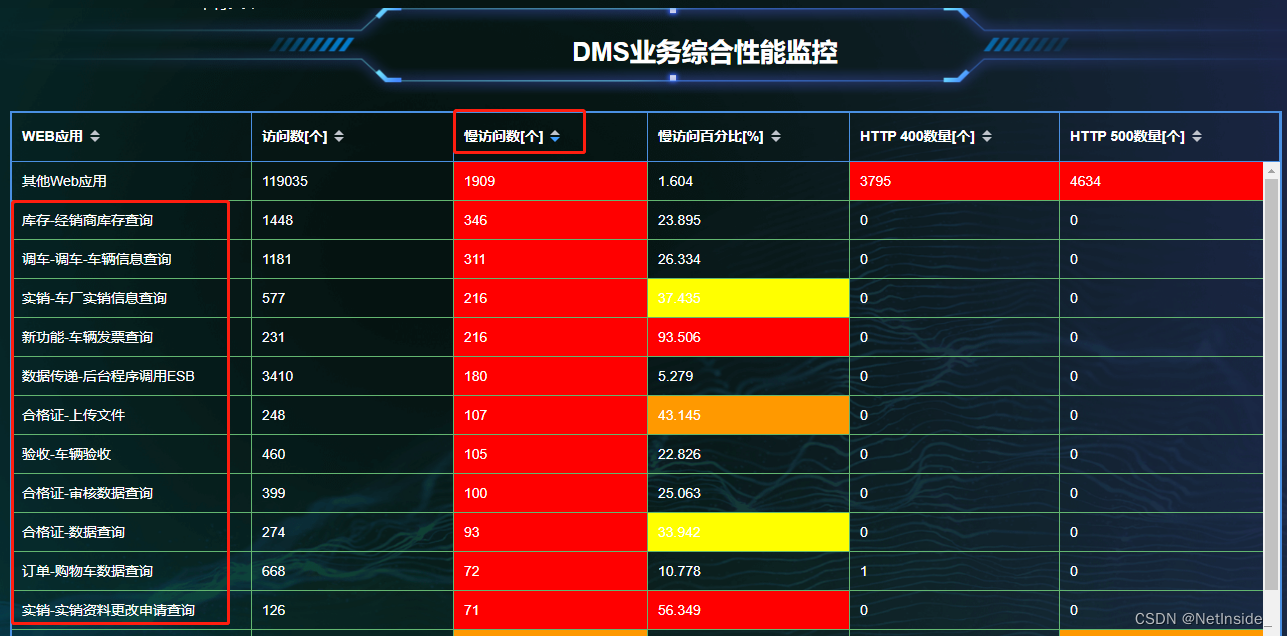 按访问快慢排序,最慢模块分别是:库存-经销商库存查询、调车-调车-车辆信息查询、实销-车厂实销信息查询、新功能-车辆发票查询等模块;