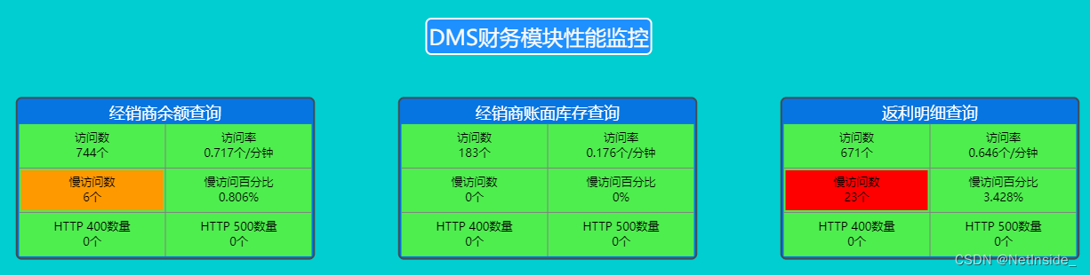 对财务模块功能监控:经销商余额查询出现慢访问6个,返利明细查询出现慢访问23个。