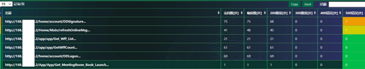 由上图可以看到,在第一个特定请求时,存在 7 次 500,而访问次数是 75 次,这种情况通常需要对中间件或逻辑进行分析,因为本上讲,几十次的访问不太会出现 500 的错误。